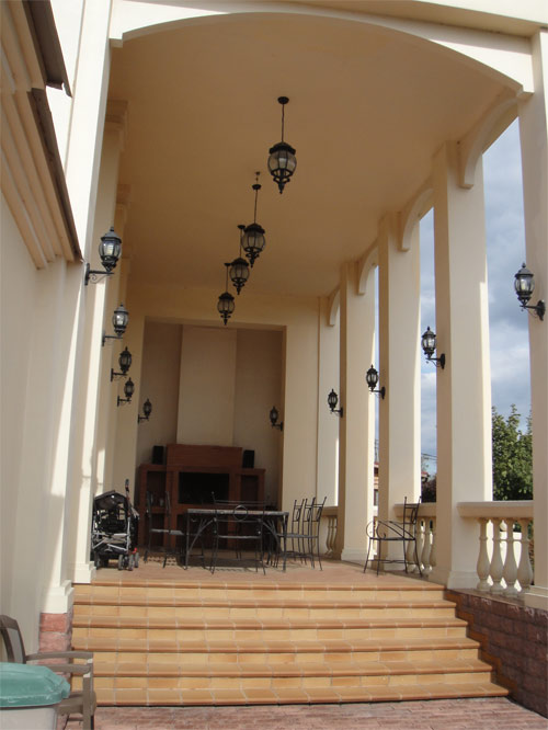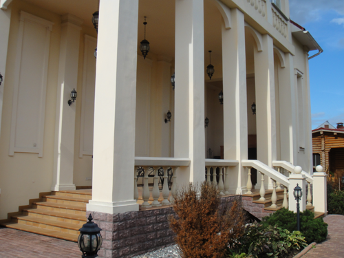 Светлый и просторный дом в классическом стиле, 780 кв.м., бетон (0-2 этаж, дерево – 3-4 этаж), 4 этажа+цоколь из бетона, 5 спален, бильярдная, зимний сад-50 кв.м., детская мансарда со спальными местами 60 кв.м., гостинная с кинотеатром, камин, столовая со вторым светом, кухня 23 кв.м., 6 санузлов. Цоколь для обслуживающего персонала: спальня, 2 рабочие комнаты, кухня+санузел, 2 технических помещения (отопление, водоснабжение), гараж. Открытые террасы: на 2 и 3 этажах по 25 кв. м., уличная терраса с камином-50 кв.м.